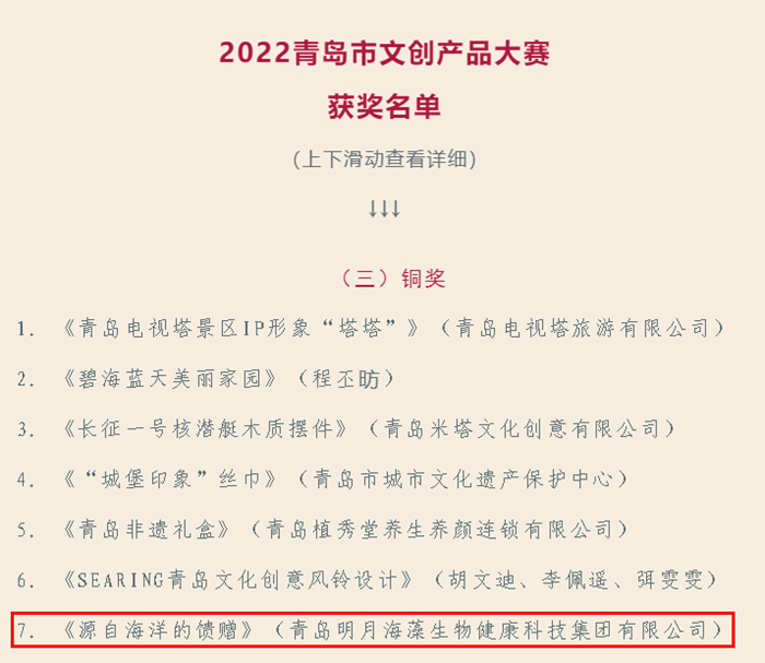 2022年,為保護、傳承、利用好傳統(tǒng)文化,推動優(yōu)秀傳統(tǒng)文化創(chuàng)造性轉化、創(chuàng)新性發(fā)展,落實《“山東手造”推進工程實施方案》,青島市文化和旅游局、青島市廣播電視臺、青島開放大學共同啟動“山東手造 青島有禮”2022青島市文創(chuàng)產(chǎn)品大賽。經(jīng)過網(wǎng)絡線上投票,11月26日,最終評選出“2022青島市特色伴手禮”十項,金獎10件、銀獎21件、銅獎32件及優(yōu)秀獎94項。青島明月海藻生物健康科技集團有限公司文創(chuàng)產(chǎn)品《源自海洋的饋贈》榮獲設計類銅獎。